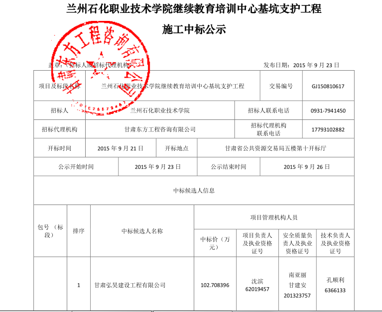 公司中标兰州石化职业技术学院继续教育培训中心基坑支护工程